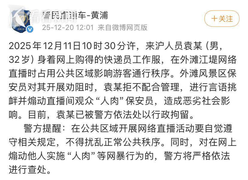 上海黄浦警方20日通报,一名男子占领外滩堤防直播,被保安驱赶,并促使观众进行“人肉搜索”。 12月11日10时30分左右,来沪游客袁某(男,32岁)身穿网购快递制服,在外滩堤岸直播时占用公共场所,影响游客交通秩序。当外滩景区保安试图阻止时,袁某不配合管理,在直播间进行言语挑衅,煽动观众“人性化”保安,造成社会不良影响。目前,袁某已被警方依法行政拘留。警方提示:在公共场所进行网络直播活动时,必须刻意遵守相关规定,不得扰乱正常公共秩序。与此同时,对于煽动他人实施网络“人肉”等网络暴力行为的,警方将严格依法查处。编辑:刘庆阳 编辑:陈毅